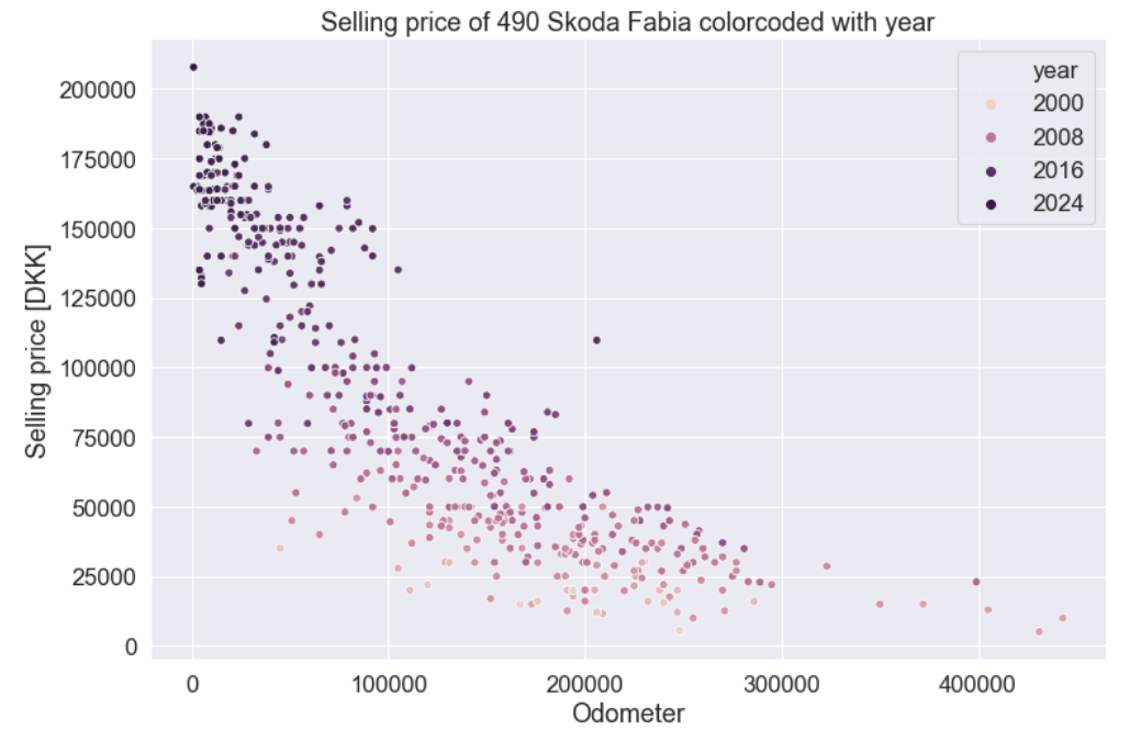 To get data for the analysis I wrote a simple scraper that got basic data from 490 Skoda Fabia’s currently on sale on bilbasen.dk, the script can be seen here and should be fairly easy to hack for another model: